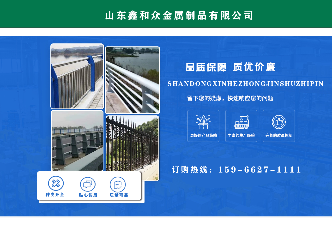 山東鑫和眾金屬制品有限公司主要產(chǎn)品有防撞護欄,橋梁護欄,道路護欄,河道護欄,不銹鋼護欄等護欄。提供設(shè)計方案,一站式定制,包您滿意價格優(yōu)惠,歡迎來電咨詢! 公司常年從事銷售護欄防撞護欄,橋梁護欄,道路護欄,河道護欄,不銹鋼護欄,橋梁鋼護欄,河道燈光護欄等。產(chǎn)品廣泛應(yīng)用于橋梁、河道、旅游景區(qū)、道路、公路、公園、小區(qū)、景觀、道路防撞等領(lǐng)域?! 」井a(chǎn)品均采用優(yōu)質(zhì)不銹鋼材料,符合相關(guān)標準。各種型號不銹鋼復(fù)合管及護欄,質(zhì)量嚴格把控。產(chǎn)品強度高、耐腐蝕、焊接牢固、抗沖擊、性能好,防撞護欄結(jié)構(gòu)簡單、美觀實用大方?! g迎前來訂購!...